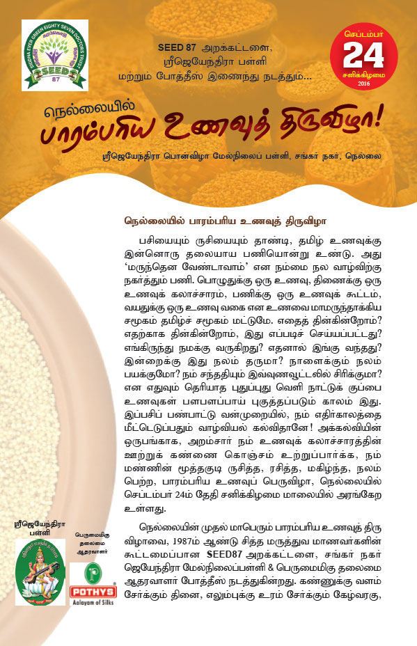 Our seed trust first mega food festival will be held on 24th September 2014 at Sri Jeyendra Saraswathi Golden Jubilee Matriculation Higher secondary school at Sankar nagar, Tirunelveli. The main aimof this event is to popularise food items made of traditional food grains among the urban population, especially the younger generation, and teach them methods of preparing such dishes, known for their nutritional value.