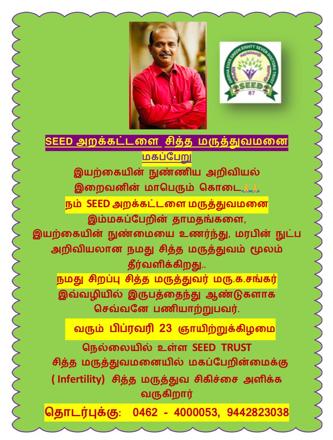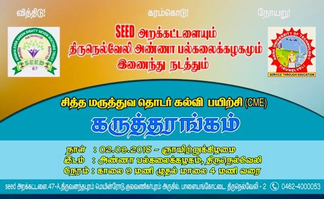 In Association with Anna university, Tirunelveli division, SEED TRUST is conducting a seminar on Continuous Medical Education (CME) Siddha Medicine on Sunday 2nd September 2018 @ Anna University, Nellai.